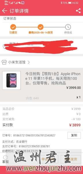 1.2020.8.4,本人因手机坏了,所以在绿森商城上购买商品iPhone11 64G 白色一台。总计3899元,实付3899元。单号为:818637215965513567812343827。