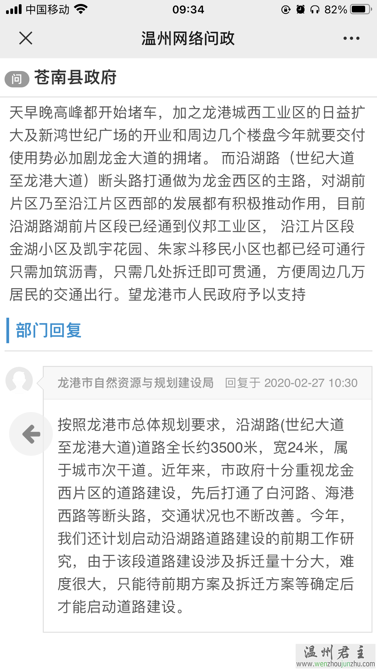 阿登儿吖向龙港市政府问:龙港沿湖路断头路