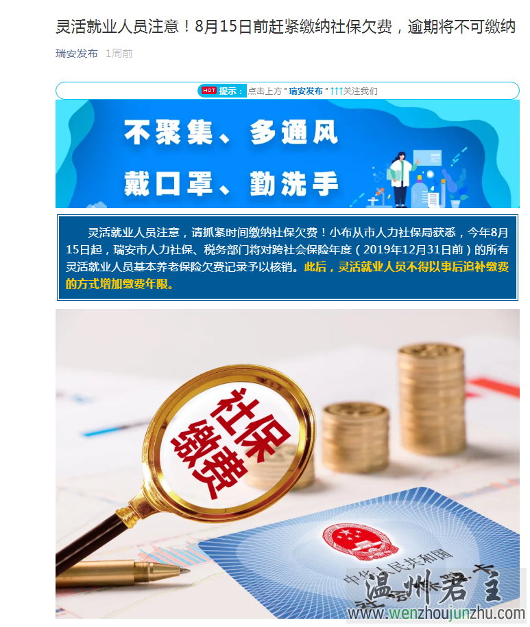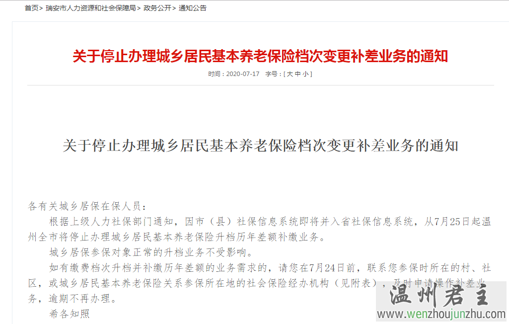 本人在瑞安发布的微信公众平台里面只看到一条关于灵活就业人员社保费历年欠费公告,该公告显示灵活就业人员可以在8月15日前缴纳社保欠费,但是在瑞安市人力资源和社会保障局局官网上又发布一则关于停止办理城乡居民基本养老保险档次变更补差业务的通知,时间节点是24号前。关于这类政策,浙江省的发布文件日期是17号,瑞安市在17号通知到乡镇,由乡镇通知到村里,信息传达时间过短,信息不对称。再加上本人所在的梧岙村根本没有接到任何补缴的通知,村名根本不知晓。24号一周的时间,对于在外地务工的人来说根本来不及。请相关部门引起重视,据我所知,温州市其他地区都是在8月15号前补缴就可以,希望瑞安市给予公正公平的补缴时间,让政策落实清楚,信息传达到位。