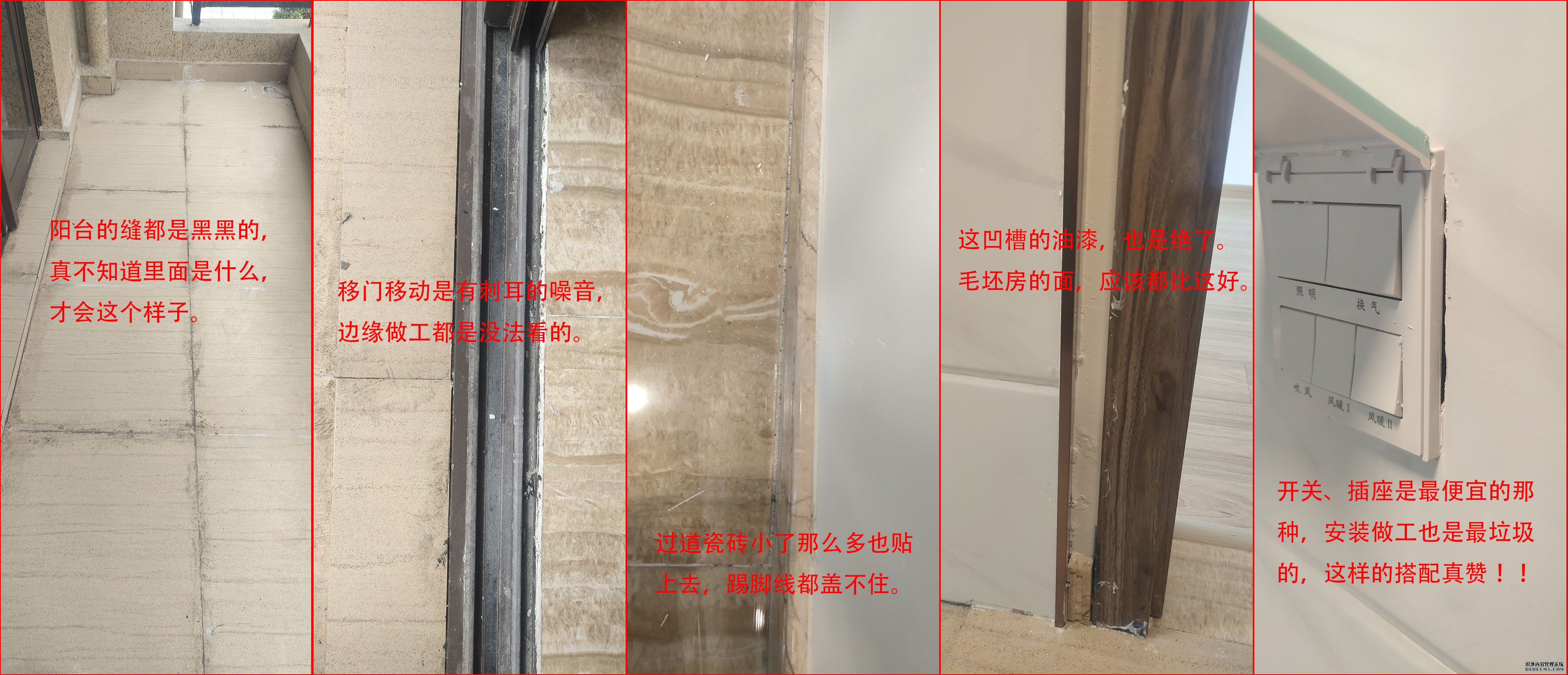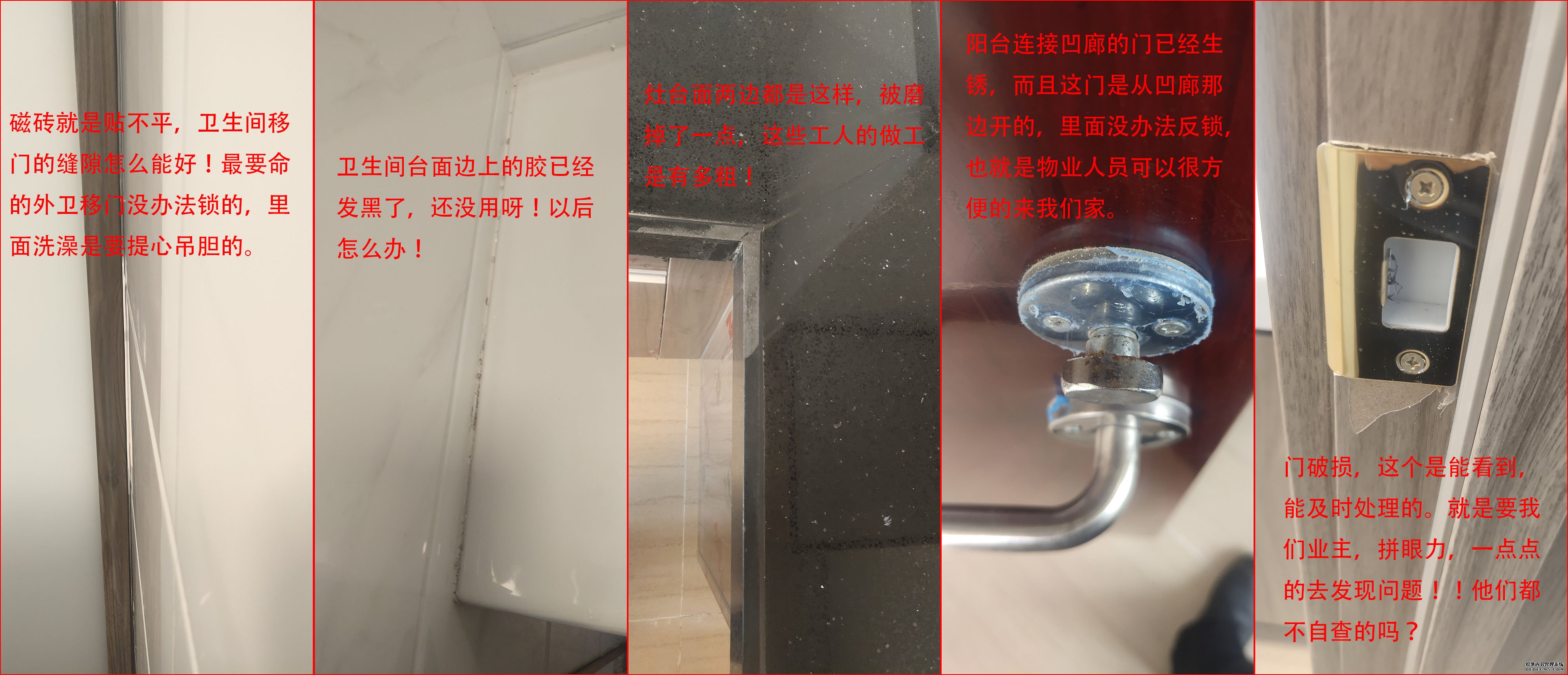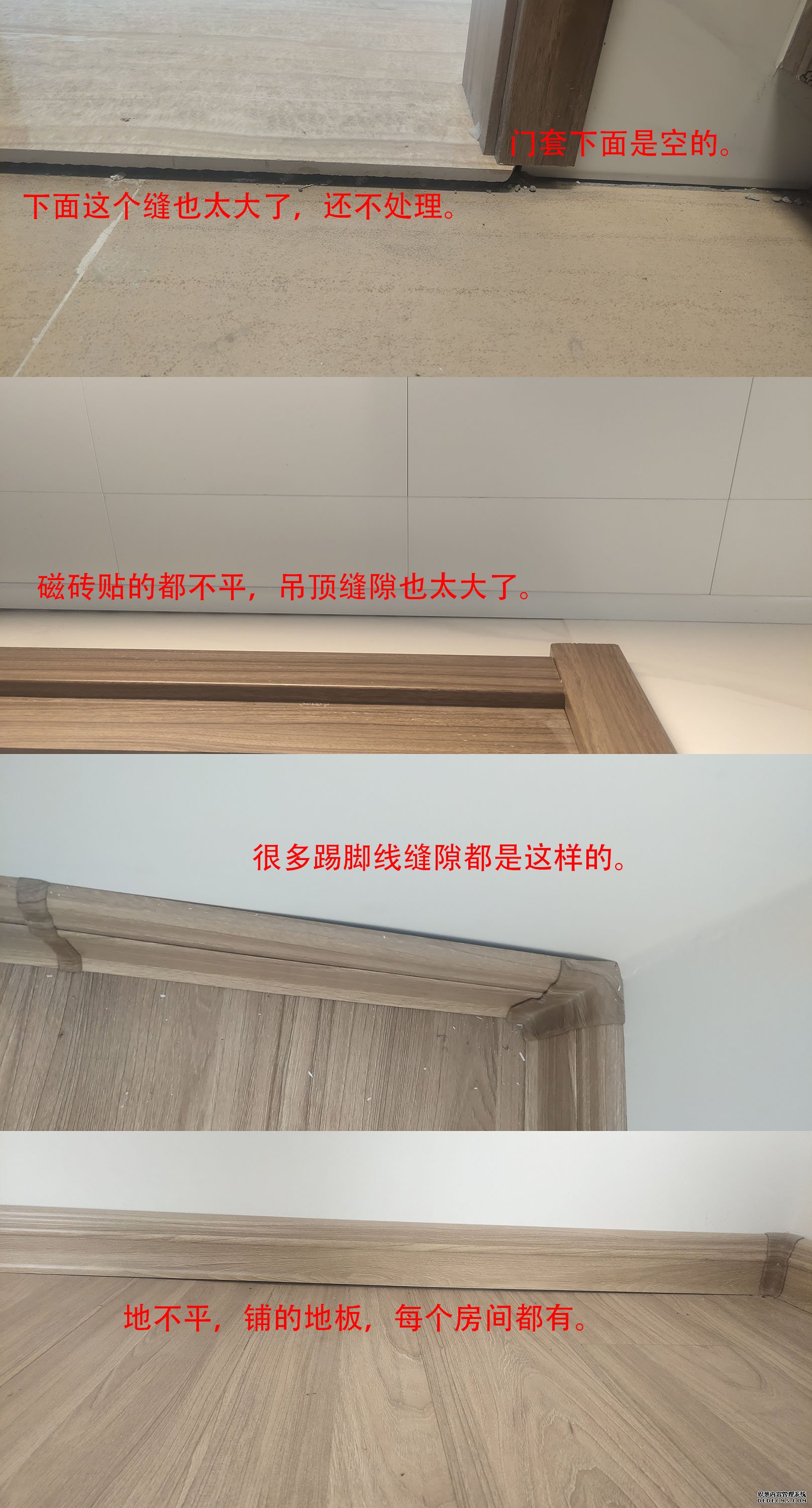 20号交付,我们看了一上午,就找出近30处问题。各种地不平、墙不平、瓷砖不平、返碱、缝隙大、吊顶漏水……。过了一周再去看,很多问题还在,处理了的也是糊弄式的维修!这些装修问题,还都普遍存在!