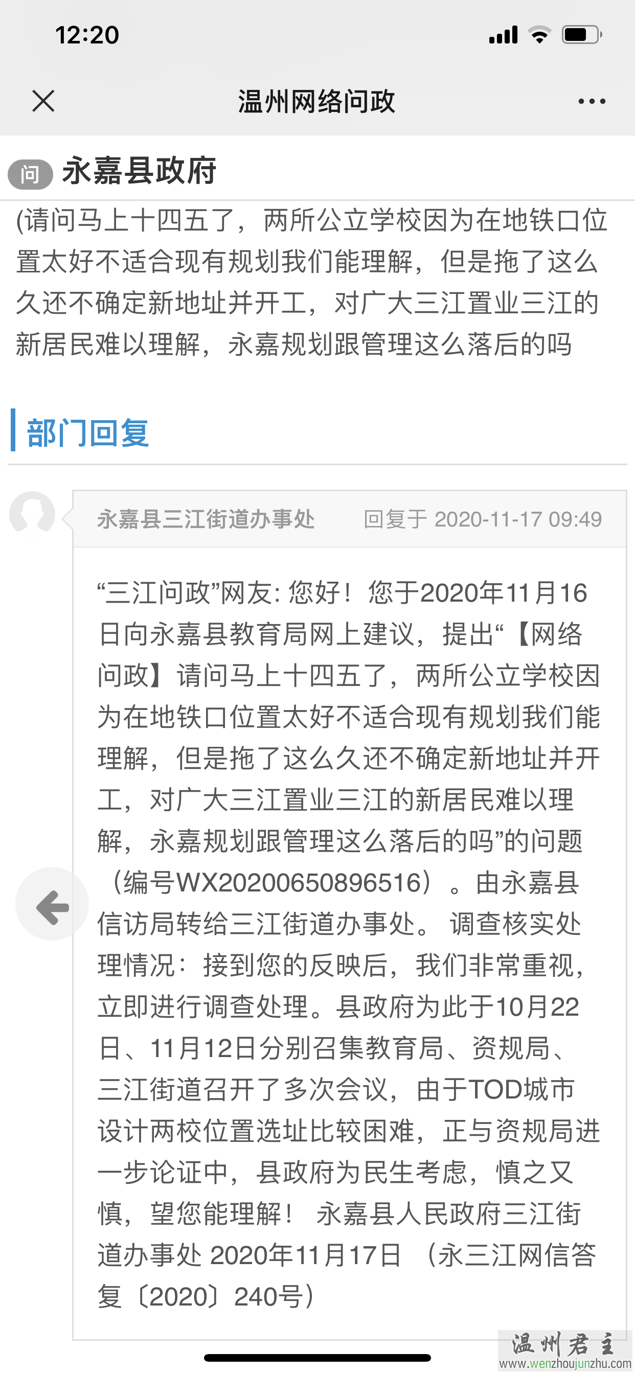 “问啊问不到”网友:您好!您于2020年11月16日向永嘉县教育局网上建议,提出“【网络问政】从前几年开始就说选完址预计什么年内动工,到现在得一拖在拖?现在又说选址待定,你们说话就这么没公信力吗???还谨慎又谨慎,望理解。那官老爷有理解过三江村民吗?或者让各位官老爷子女来八小跟四中上学可好???站着说话不腰疼,官字两张口。”的问题(编号WX20200657619705)。由永嘉县信访局转给三江街道办事处。调查核实处理情况:接到您的反映后,我们非常重视,立即进行调查处理。县政府为此于10月22日、11月12日分别召集教育局、资规局、三江街道召开了多次会议,由于TOD城市设计两校位置选址比较困难,正与资规局进一步论证中,还未定下来,望您能理解!永嘉县人民政府三江街道办事处2020年11月18日(永三江网信答复〔2020〕248号)